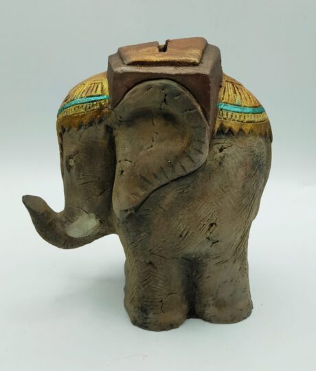 ‘Οταν ο κεραμικός κουμπαράς – ελεφαντάκι,στο χρώμα του πηλού, ήρθε στα χέρια μου από εργαστήριο κεραμοποιίας, τον φαντάστηκα αληθινό με τα φυσικά του χρώματα. Με το ροζιασμένο δέρμα του, με το πολύχρωμο χαλάκι στη ράχη του! Δουλεύτηκε με χρώματα υβριδικά, με μεταλλικά χρώματα, με λάδι, με υγρό κερί στην παραμικρή λεπτομέρεια. Είναι ένα διακοσμητικό που τραβάει το βλέμμα μικρών και μεγάλων