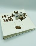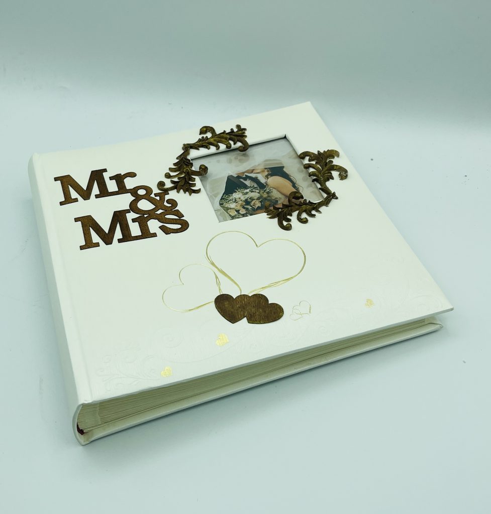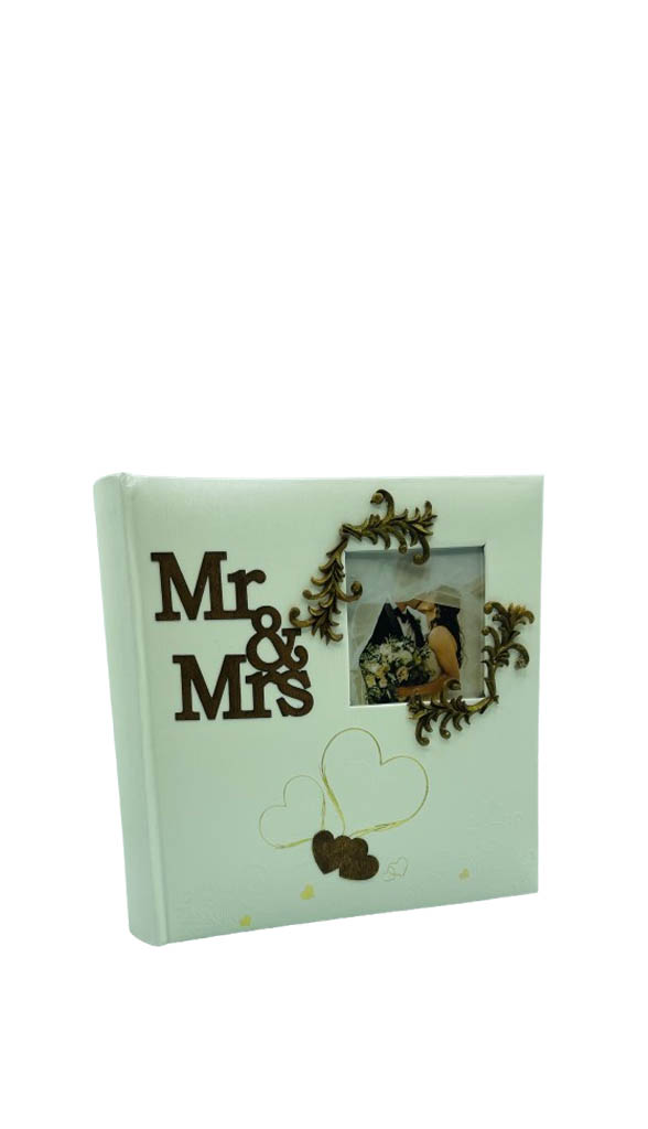 ‘Eνα άλμπουμ για τις φωτογραφίες από την σημαντική μέρα της ζωής σας. Τον γάμο σας, την τελετή που εσείς διαλέξατε ή το έγγραφο που εσείς υπογράψατε και συμβολίζει τη μέρα αυτή. Τετράγωνο διαστάσεων 25 Χ25, σε λευκό ιβουάρ χρώμα άλμπουμ 30 φύλλων για φωτογραφίες με ριζόχαρτο προστασίας ανάμεσα. Με χειροποίητη επεξεργασία, ξυλόγλυπτα διακοσμητικά, σε φύλλο ξύλου Mr and Mrs και καρδούλες. Βαμμένα σε καφέ αποχρώσεις. Μία μοναδική δημιουργία για εσένα ή για να χαρίσεις σε αγαπημένους σου ένα χειροποίητο δώρο γάμου.