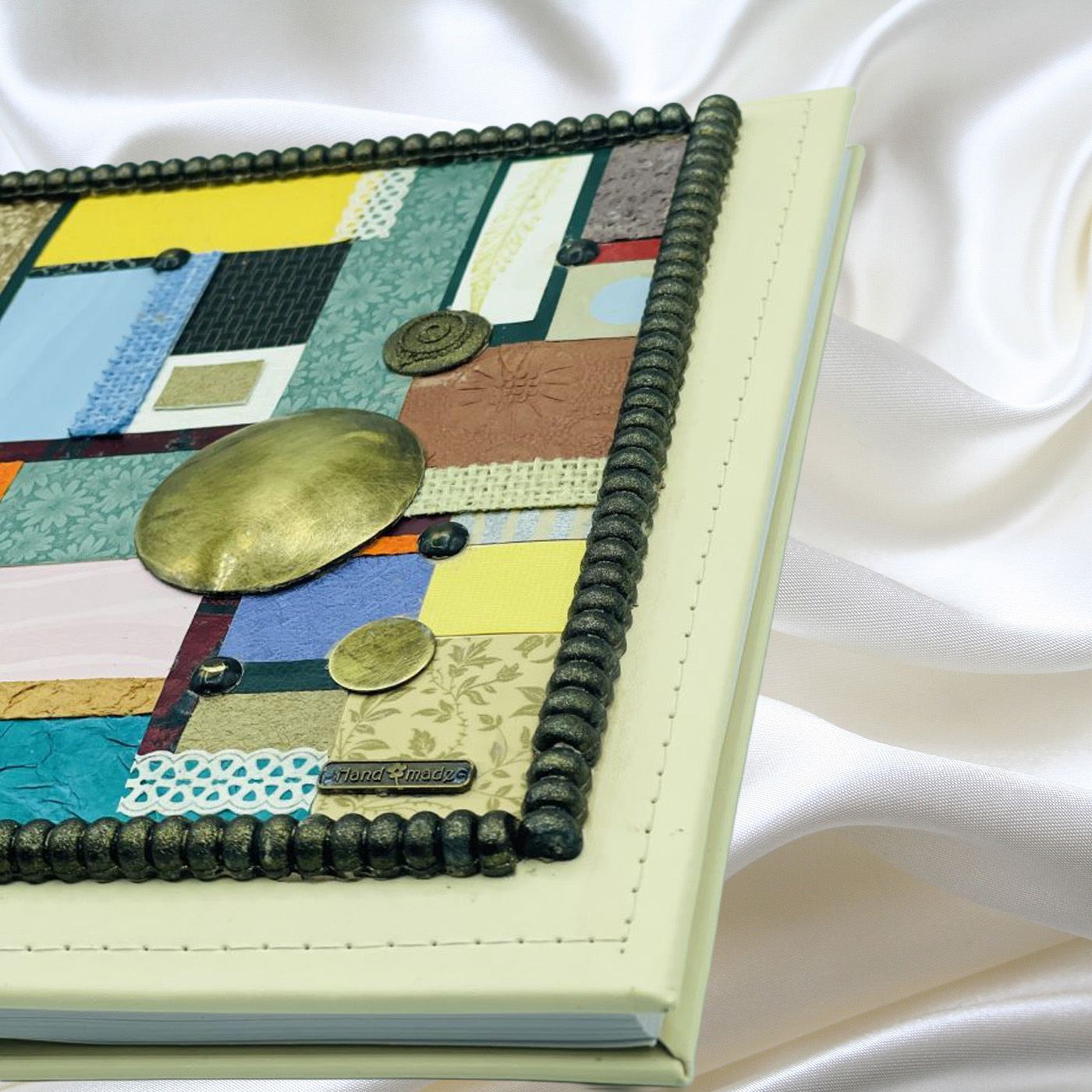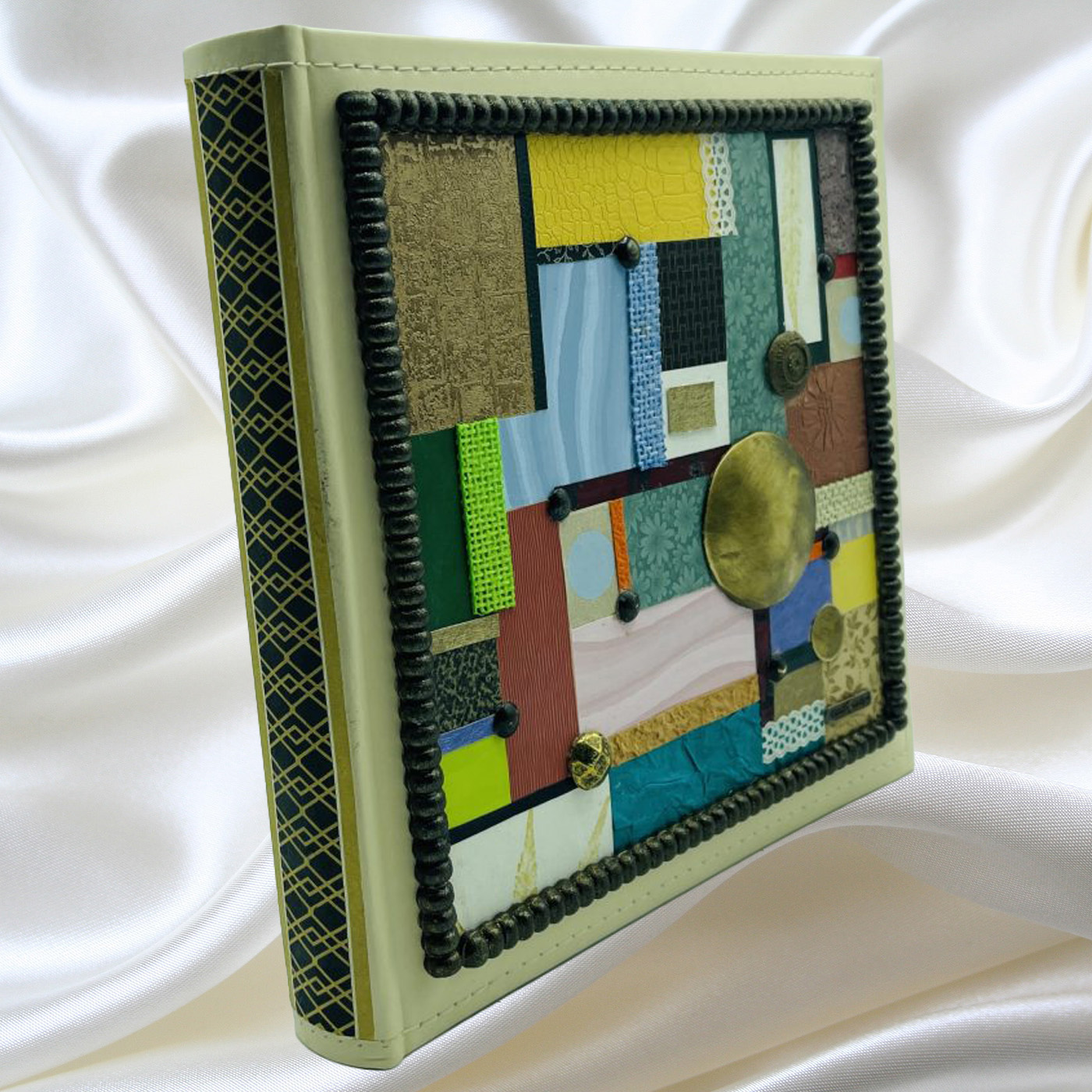 ‘Eνα άλμπουμ για φωτογραφίες με την τεχνική patchwork, πολύχρωμο. Με χειροποίητη επεξεργασία, κομμάτι κομμάτι η σύνθεσή του, μεταλλικά στοιχεία και ξυλόγλυπτη τρέσσα με βάψιμο στο χέρι. Χειροποίητο δώρο.