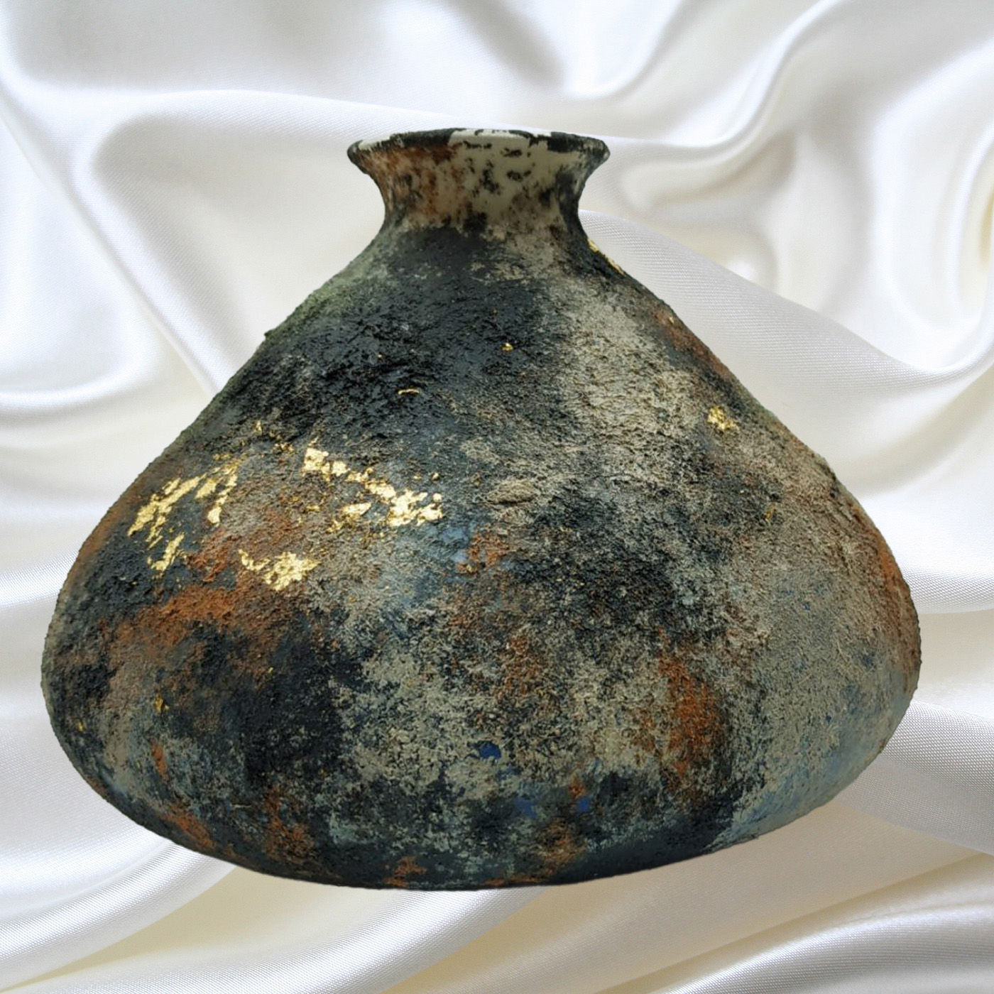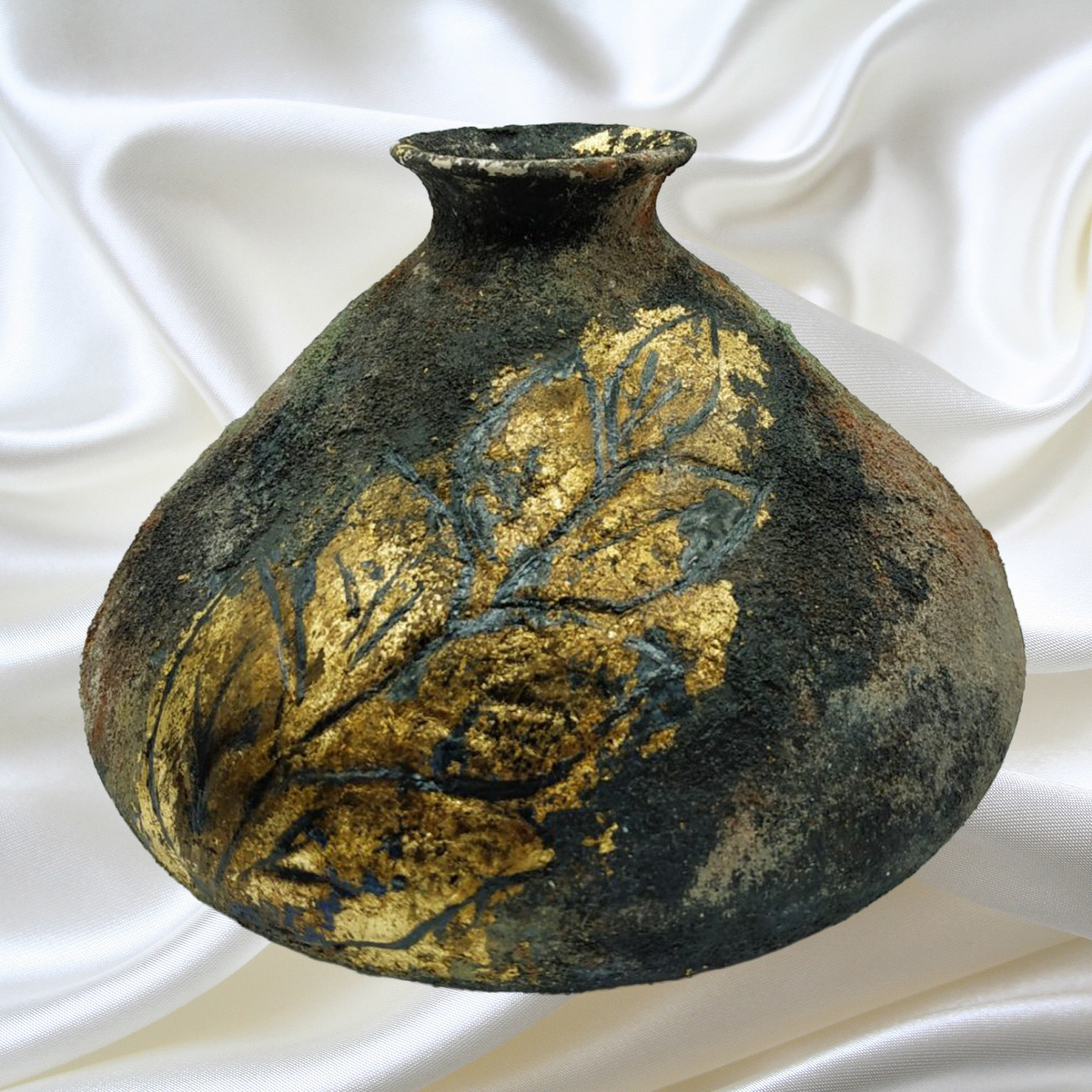 Βάζο κεραμικό τριγωνικό διαστάσεων ύψους 15 και πλάτους 14 εκ. Με χειροποίητες τεχνοτροπίες ανάγλυφου και φύλλα χρυσού. Για διακόσμηση