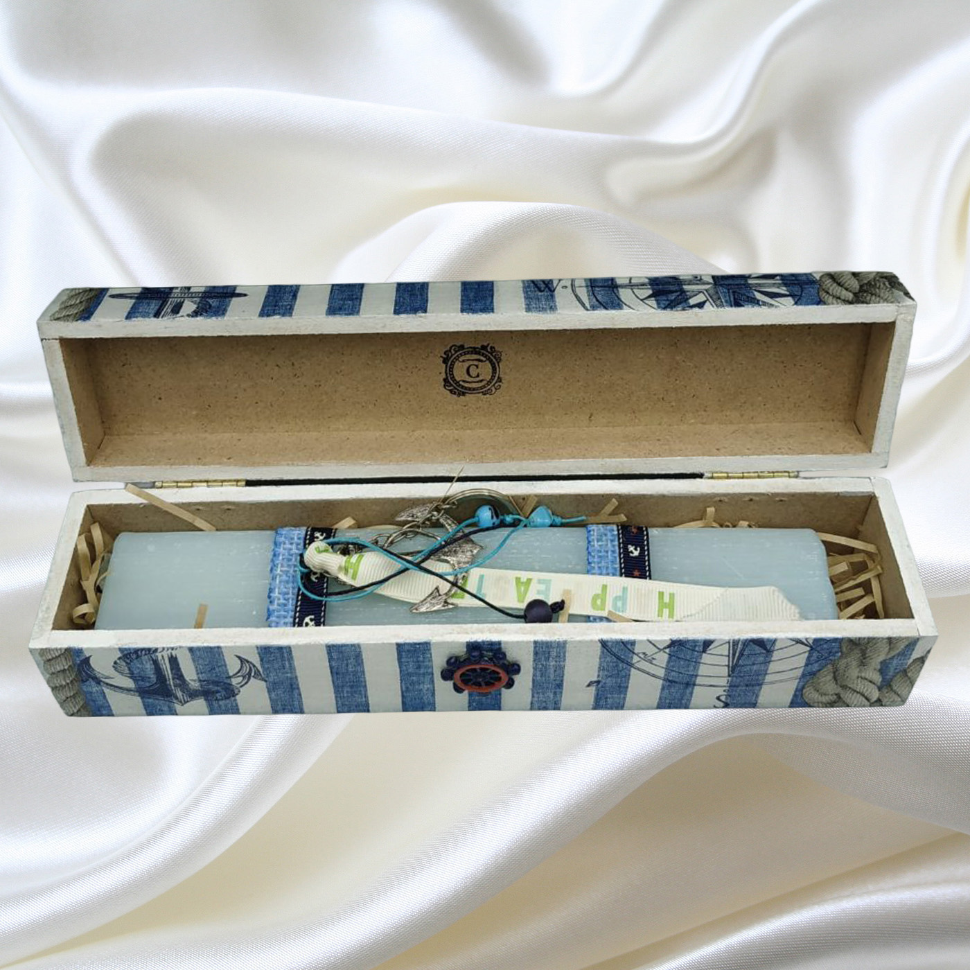 Λαμπάδα αρωματική σιέλ διαστάσεων 22Χ4Χ2 σετ με το χειροποίητο ξύλινο λαμπαδόκουτο. Λαμπάδα παιδική, νεανική με μπρελόκ άγκυρα. ‘Ομορφο κουτί που θα μείνει, για οποιαδήποτε χρήση.
