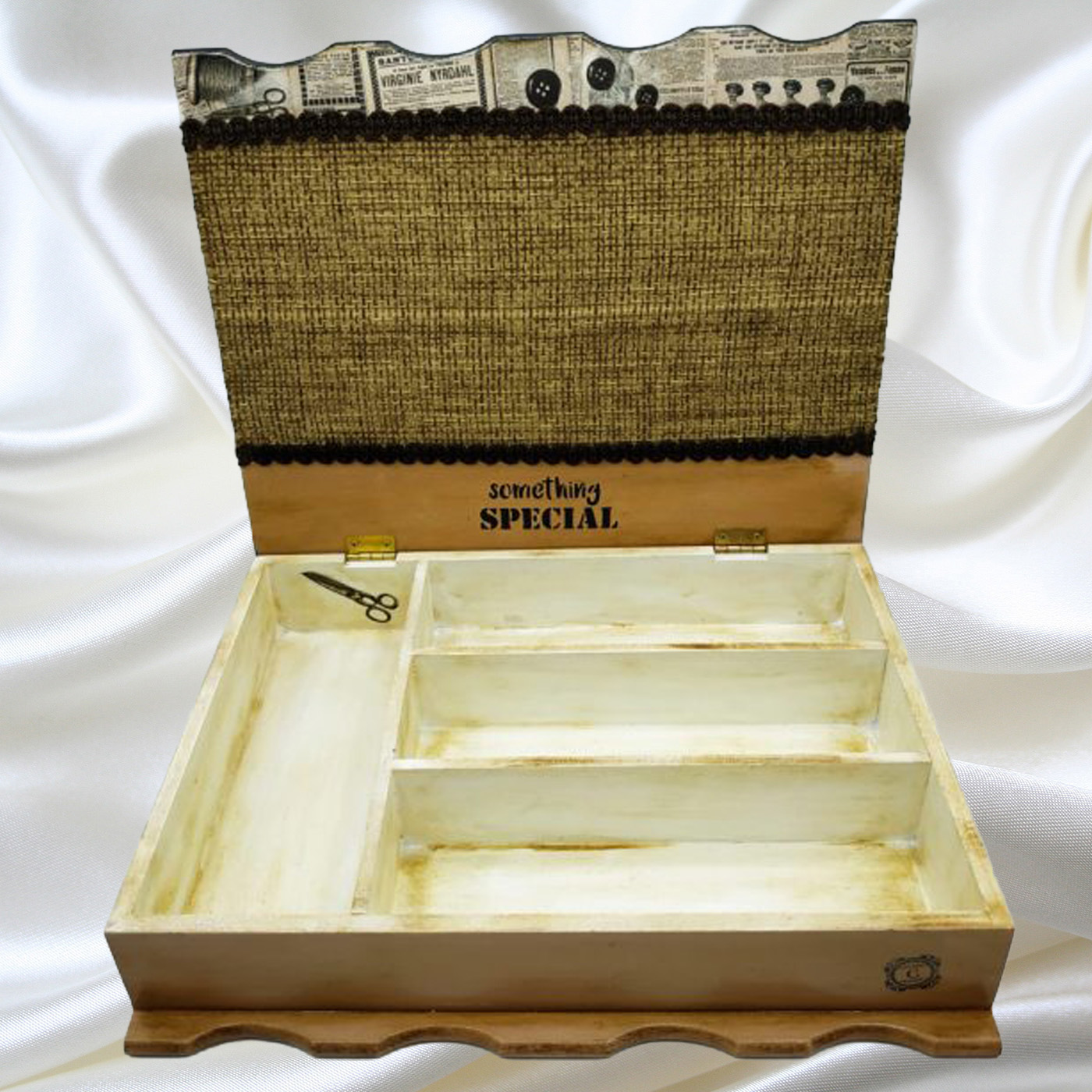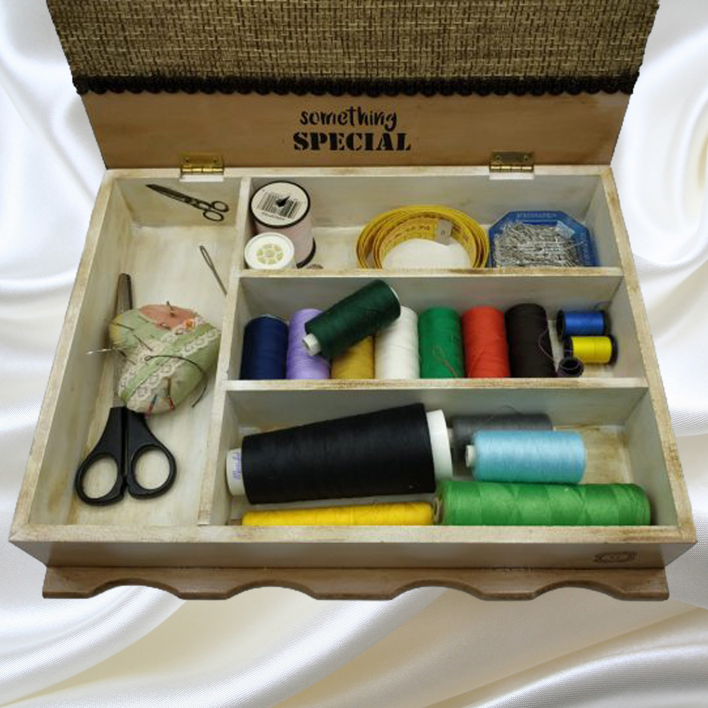 Ξύλινο oρθογώνιο κουτί ραπτικής διαστάσεων 32Χ25Χ7, με χωρίσματα για εσάς που ράβετε. Για εσάς που θέλετε να συγκεντρώσετε τακτοποιημένα τις κλωστές, βελόνες, ψαλίδια και όλα τα σχετικά με το ράψιμο. Χειροποίητο, δουλεμένο με λεπτομέρεια μέσα και έξω.’Ενα μοναδικό δώρο. Διακόσμηση σε ατελιέ ραπτικής.
