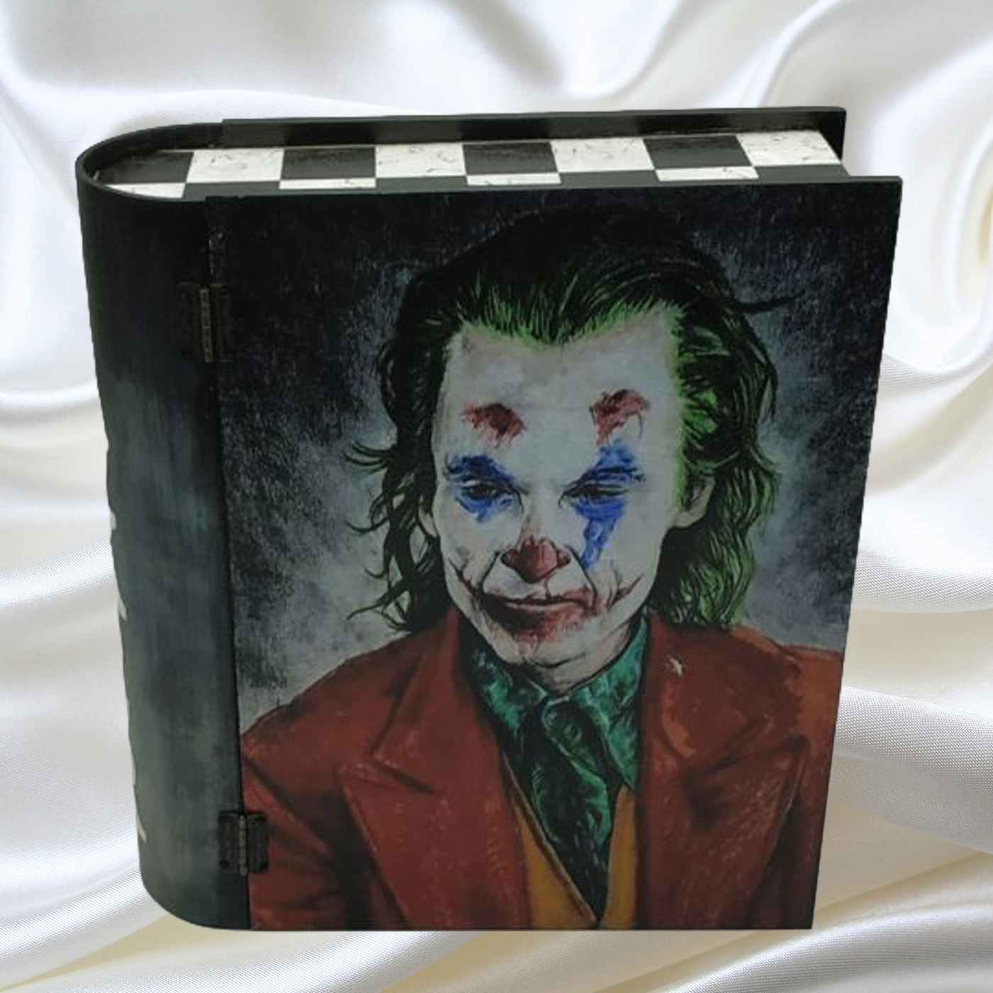 Ξύλινο κουτί-βιβλίο JOKER διαστάσεων 32Χ27Χ10 με την τεχνική του ριζόχαρτου και επεξεργασία χειροποίητη. Μέσα και έξω με λεπτομέρεια. Για το σαλόνι, το γραφείο, τον επαγγελματικό σας χώρο. Για εσένα που αγάπησες την ομώνυμη ταινία.
