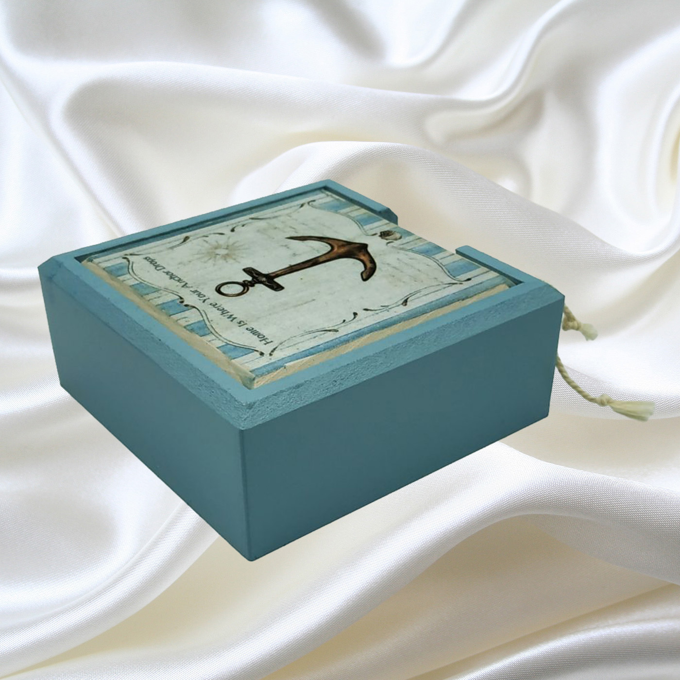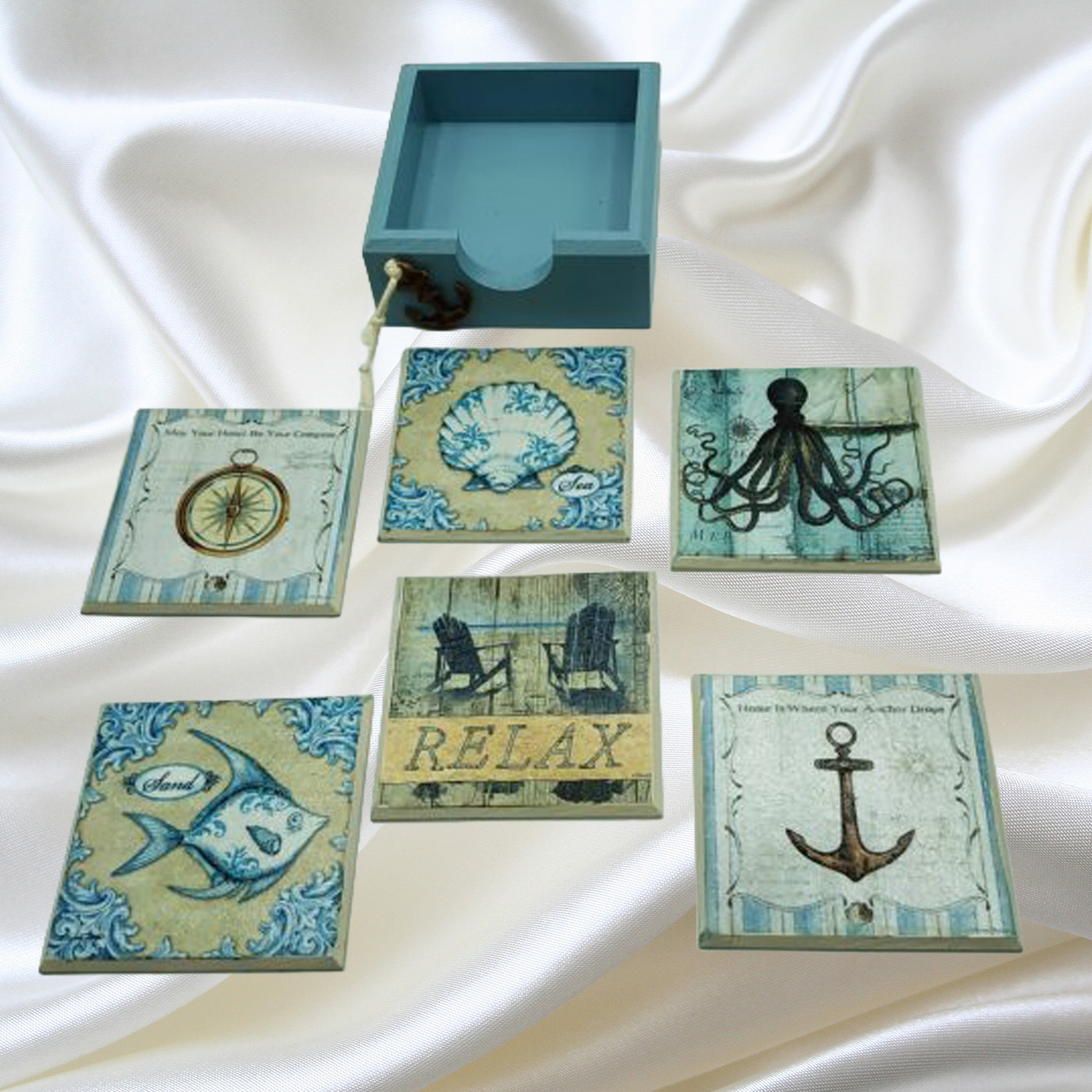 Ξύλινα έξι σουβέρ με βάση. Αγκυρες, κογχύλια. Διακόσμηση καλοκαιρινή.