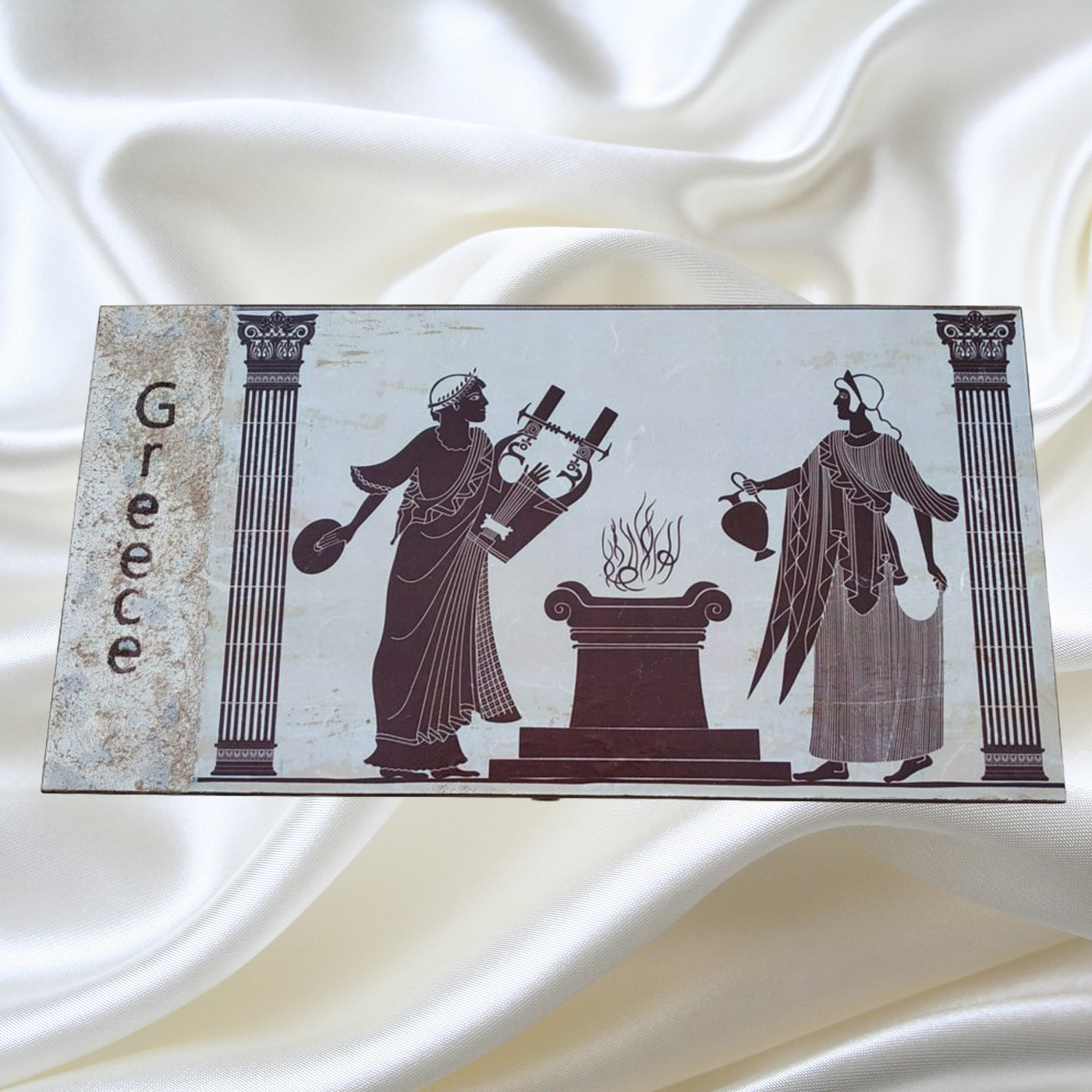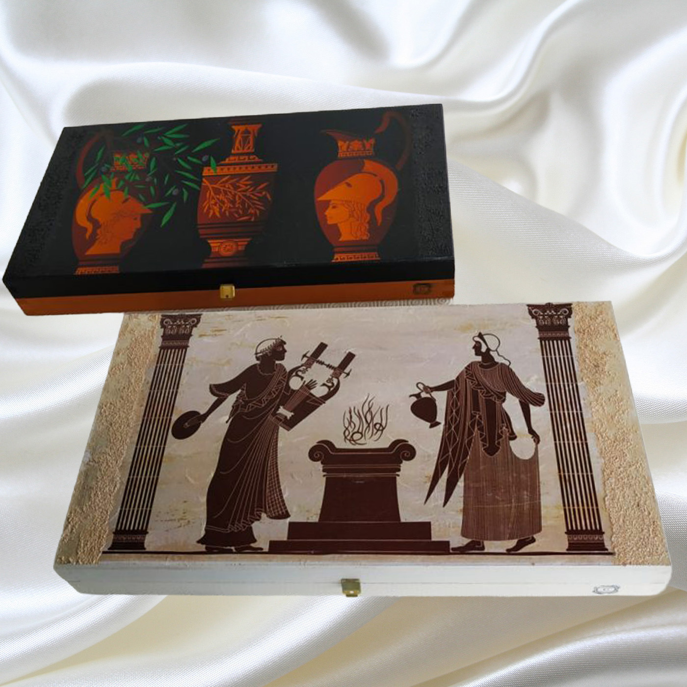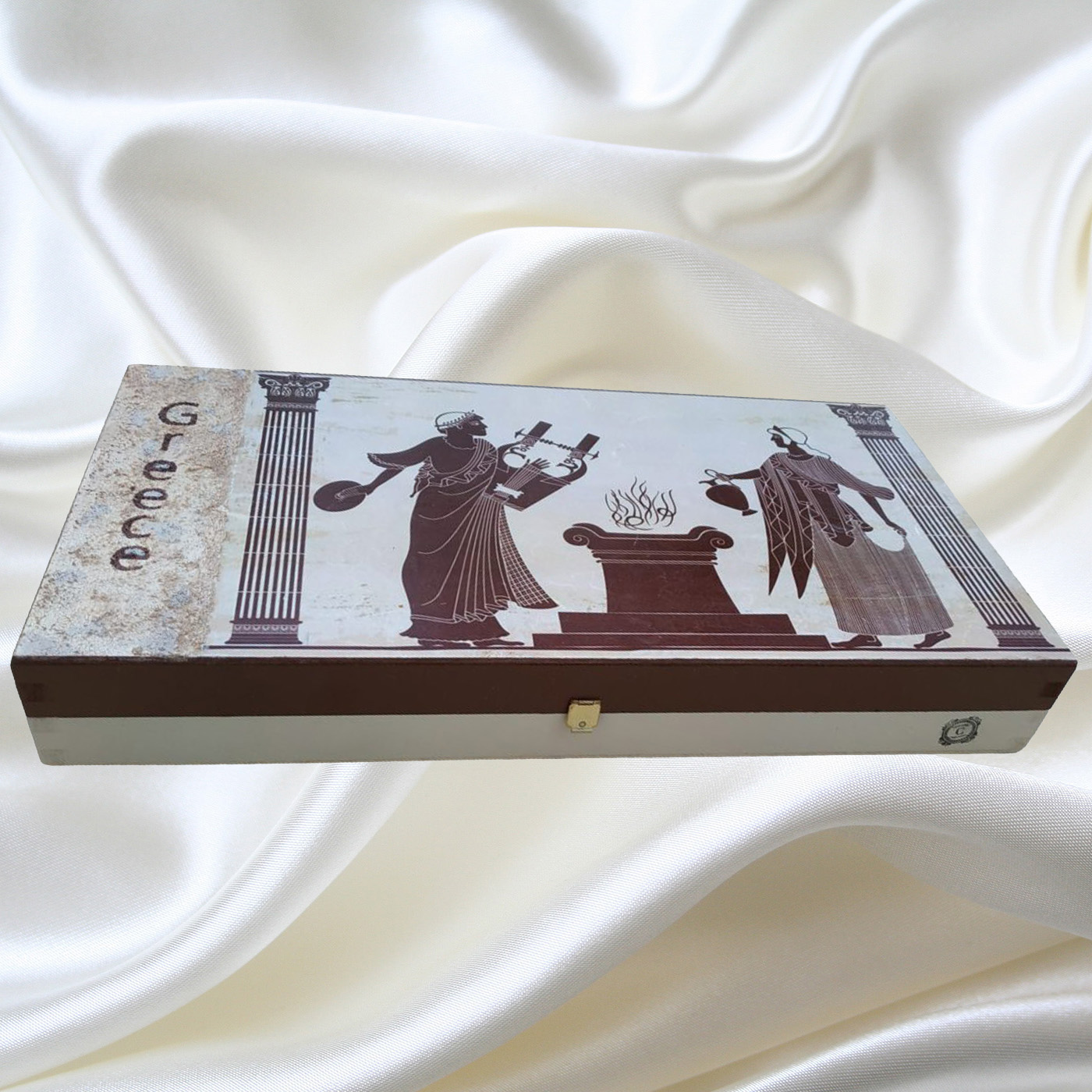 Τάβλι ξύλινο διαστάσεων 48Χ25Χ7, με παραστάσεις αρχαϊκές, στα αριστοκρατικά χρώματα εκρού και καφέ. Σετ με τα δύο ξύλινα σουβέρ.